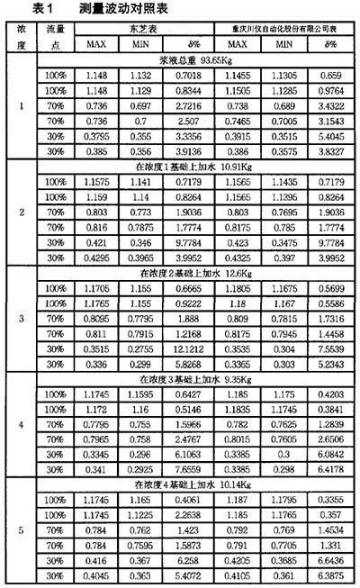 在造紙行業有大量的紙漿液體需要測量,就會用到大量的流量測量儀表,目前在造紙行業中用于測量流量的儀表,主要有測礦漿管道流量計等儀表,因為測礦漿管道流量計具有非常強的優點,所以非常適合在紙漿的流量測量中使用。在紙漿實驗裝置上,使用串聯在同一管道上該公司生產的漿液型測礦漿管道流量計與日本東芝的漿液型測礦漿管道流量計測量不同濃度和流量的紙漿漿液,以驗證其可靠性。波動率對比實驗結果表明,該產品用于紙漿漿液測量時能夠很好地克服漿液噪聲。在滿流量測量時,上述實驗中各濃度下漿液測量穩態波動率均在1%以內;其它流量下測量時,由于實驗系統主管道上游分流控制流速不穩,進而導致測量穩態波動率相對較大,甚至達到近7‰ 但由表1可知,在各種漿液濃度及各流量點下,凱銘儀表有限公司生產的漿液型測礦漿管道流量計的穩態波動率始終與日本東芝漿液型測礦漿管道流量計的測量結果一致,從而表明實驗系統的測量結果能準確反映實際漿液流量大小。 說明:MAX、MIN分別表示該組數據測得流速的的*大值和*小值,單位m/s。