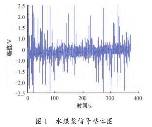 針對城市生活污水流量計測量水煤漿時出現較大波動,甚至回零這一問題,特去某煤化工企業甲醇分公司進行現場數據采集。該公司所使用的對置式四噴嘴氣化有4個噴嘴,噴嘴管道口徑為125mm,管中水煤漿流量基本穩定在19m³/h(流速約為0.48m/s)。每條噴嘴煤漿線上安裝了3臺城市生活污水流量計,每臺城市生活污水流量計由傳感器和變送器兩部分組成。選擇其中1條水煤漿管線上的1臺城市生活污水流量計進行數據采集,因為該臺城市生活污水流量計測量結果波動大,甚至出現回零的現象。將課題組研制的基于DSP的電磁流量變送器的信號線和勵磁線接到該電磁流量傳感器的電極和勵磁線圈上,組合成完整的城市生活污水流量計,進行水煤漿數據采集。使用的電磁流量變送器是以TI公司DSP芯片TMS320F28335為核心,采用高頻勵磁方案,其硬件主要包括勵磁控制系統和信號采集處理系統,具體的模塊有勵磁驅動模塊、信號調理采集模塊、信號處理控制模塊、人機接口模塊、通信模塊及電源管理模塊。信號調理采集模塊中的調理電路對一次儀表輸出的信號進行放大和濾波,截止頻率是2kHz,放大倍數約為230倍。通過NI公司USB-6216型號的數據采集卡進行數據采集,把調理電路的輸出端連接到數據采集卡的一個差分輸入端,并設置數據采集卡工作在差分的測量模式,設置采集卡的采樣頻率為10kHz。采集多組水煤漿信號數據,每組數據的時間長度為5min。
