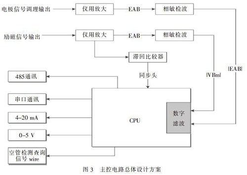 電極檢測出的微弱感應(yīng)電動(dòng)勢E, 先經(jīng)前置放大器的放大和噪聲抑制而成為大幅度低阻抗的電壓信號。此信號經(jīng)相敏檢波后,給CPU 進(jìn)行數(shù)字濾波、處理和控制,通過利用雙線性變換法將模擬的二階巴特沃斯低通濾波器轉(zhuǎn)換為數(shù)字式濾波器,既簡化電路設(shè)計(jì),且可靠性高、穩(wěn)定性好。通過編寫軟件CPU 能對放大器的溫度漂移及零點(diǎn)漂移給予補(bǔ)償, 并在測量的全量程范圍內(nèi)分10 段對信號進(jìn)行非線性修正,使得測量值更好地?cái)M合真實(shí)數(shù)據(jù)。空管檢測電路上,CPU 作為從控制器。當(dāng)主控制電路上發(fā)出空管檢測查詢信號wire, 從控制器進(jìn)行識別后接收并判斷出查詢什么信號,然后產(chǎn)生應(yīng)答信號上傳至主控芯片輸出顯示;當(dāng)檢測為空管信號時(shí), 從CPU 發(fā)出的zero 信號通過控制MOS 管開關(guān)來關(guān)斷流速輸出。在應(yīng)用中,對于微弱信號的放大及提取還需注意PCB 板設(shè)計(jì)時(shí)EMI 電磁屏蔽考慮,屏蔽來自空間磁場的干擾、周邊設(shè)備的輻射造成的干擾和板內(nèi)之間的干擾,如數(shù)模分離、強(qiáng)弱電分離等等。