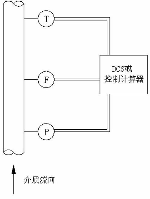 流量計、溫度變送器、壓力變送器單獨安裝,流量信號、溫度信號、壓力信號分別輸入DCS或控制計算器進行流量的溫度、壓力補償計算,完成流量、壓力、溫度各參數(shù)的顯示、輸出、打印等功能。此種結(jié)構(gòu)安裝靈活,特別適用于現(xiàn)場流量計的升級改造,如圖2所示。號、溫度信號、壓力信號輸入到溫壓補償功能設(shè)計的流量計轉(zhuǎn)換器中,進行流量的溫度、壓力補償計算,完成流量、壓力、溫度各參數(shù)的顯示、輸出、打印等功能。此種結(jié)構(gòu)測量準確度高,體積小,安裝方便,如圖3所示: