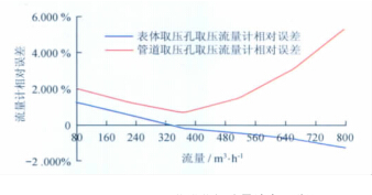 從以上數(shù)據(jù)表和曲線圖中可以看出:天燃?xì)饬髁坑?jì)型號(hào)一定的情況下,用表體取壓孔取壓方式檢定流量計(jì)時(shí)流量計(jì)的線性度較好,用管道取壓孔取壓方式檢定流量計(jì)時(shí)流量計(jì)的線性度較差;流量測(cè)點(diǎn)相同的情況下,表體取壓孔取壓檢定方式的流量計(jì)誤差較小,管道取壓孔取壓檢定方式的流量計(jì)誤差較大;兩種取壓方式引起的誤差隨著流量的增大而逐漸增大,在流量為2 900m3/h時(shí)兩者相差近6.2%,遠(yuǎn)遠(yuǎn)超出了流量計(jì)的準(zhǔn)確度等級(jí)。所以,在天燃?xì)饬髁坑?jì)的檢定過(guò)程中,應(yīng)避免在流量計(jì)表體取壓孔以外的地方取壓進(jìn)行檢定。