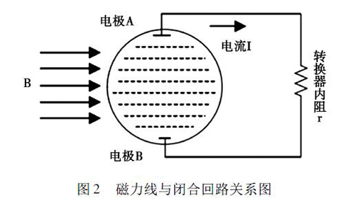 2. 1 正交干擾鹽水流量計的磁路系統包含有兩個勵磁線圈,而導管內的液體與傳感器電極及轉換器結構組成了一個閉合的回路,如圖2 所示。理論情況下,磁力線( 圖中B) 應與閉合回路相平行,但是由于裝配過程中的誤差,導致磁力線不可能完全平行于這一閉合回路,出現部分磁力線成一定角度穿過回路的現象,這引起了即使沒有液體流動的情況下,傳感器的電極上也會產生感應電動勢,就形成了正交干擾的基本形式。