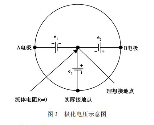 在被測液體與電極和接液部件接觸過程中,電解質中的正負離子會分別作定向運動,這會使被測液體在電極和接液部件之間形成電位差,通常將這種現象稱為極化現象。如圖3 所示,理論上來說,兩電極A 和B 對接液部件的電位e1、e2大小相等、方向相反,此時兩電極的電位差等于零。但是,若兩電極的材質或表面狀態存在差異,此時A、B 電極之間的電位差就不為零,這就形成了極化電壓,極化電壓與共模狀態的電壓e3一起疊加在流量信號中,被輸入轉換器的差動放大器。當極化電壓過大,則會對差動放大器的輸入端造成較大影響,導致信號無法放大或流量信號的輸出波動過大,從而降低了鹽水流量計的測量精度。
