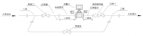 成品油流量計(jì)在測(cè)量過(guò)程中對(duì)直管段的一般性要求為:流量計(jì)必須水平安裝在管道上(管道傾斜在5以內(nèi)),安裝時(shí)流量計(jì)軸線應(yīng)與管道軸線同心,流向要一致。 流量計(jì)上游管道長(zhǎng)度應(yīng)有不小于2D的等徑直管段,如果安裝場(chǎng)所充許建議上游直管段為20D、下游為5D。