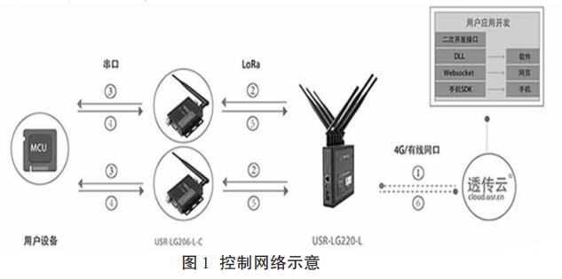 基于 LoRa 技術的無線流量計由控制,計量,通信,電源,存儲五個模塊組成。以液體流量計為主體的計量模塊將采集到的供暖管道數據發送到通信模塊,基于 LoRa 技術的通信模塊將流量數據存儲并且發送到由管理人員監控的控制模塊,管理人員通過控制模塊和通信模塊向流量計發送指示。電源模塊是無線流量計的能源中心,可以為流量計的其他模塊提供動力支持。流量計安裝完畢后可在小區內形成控制網絡,網絡示意圖如圖 1 所示。