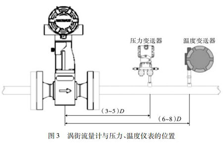 氮氣流量計的口徑如果與工藝管道相同,不能滿足流量儀表要求時,或者在此流速下測量準確度不能保證時,需要縮小儀表口徑,從而提高管內(nèi)流速,保證測量精度。上下游必須有足夠的直管段,若傳感器安裝點的上游在同一平面上有 2 個 90°彎頭時,上游直管段≥25D,下游直管段≥5D。根據(jù)測量的需要,需在氮氣流量計附近測量壓力和溫度時,測壓點應在傳感器下游的( 3 ~ 5) D 處,測溫點應在傳感器下游的( 6 ~ 8) D 處,如圖 3 所示。