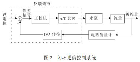 通信控制系統(tǒng)由工控機(jī)、變頻器、水泵、數(shù)據(jù)采集卡、化工污水流量計等組成。在整個熱量表耐久性試驗裝置中,化工污水流量計與被試驗熱量表串聯(lián)在試驗管路中。系統(tǒng)設(shè)定流量值 qs,通過工控機(jī)發(fā)送信號給變頻器,來控制水泵運(yùn)轉(zhuǎn),系統(tǒng)通過研華數(shù)據(jù)采集卡 PCI1711 將采集到的化工污水流量計當(dāng)前瞬時流量值反饋給工控機(jī),工控機(jī)將返回流量值與設(shè)定流量值qs進(jìn)行比較,從而確定是否需要重新調(diào)整變頻器頻率控制水泵轉(zhuǎn)速。此過程是一個完整的閉環(huán) PID 控制過程,其閉環(huán)控制過程如圖 2 所示。 2. 2 管路切換系統(tǒng)管路切換主要由冷熱水箱、水泵、開關(guān)閥等組成。要實現(xiàn)熱量表耐久性 4000 次冷熱沖擊試驗,需要實時控制管路中熱水與冷水的交替使用。