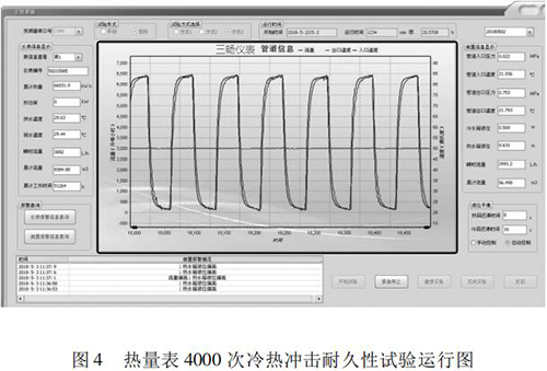 本文研究的 4000 次冷熱沖擊試驗的實現(xiàn)具有以下特點(diǎn): (1)基于“工控機(jī) +水泵 + 化工污水流量計”的閉環(huán)控制系統(tǒng),實現(xiàn)了流量自動反饋調(diào)節(jié),滿足試驗要求; (2)通過四個開關(guān)閥的時序切換,自動控制試驗溫度,很好的完成了 4000 次溫度沖擊試驗; (3)通過“工控機(jī) + 數(shù)據(jù)數(shù)據(jù)采集卡”的數(shù)據(jù)采集系統(tǒng),實時監(jiān)控試驗過程中的流量、溫度、壓力等相關(guān)參數(shù),實現(xiàn)試驗方式的自動控制,并能對試驗數(shù)據(jù)進(jìn)行分析與評定。 (4)試驗的全過程為智能自動化,可無人員留守看護(hù)。試驗結(jié)果可直接反映出熱量表在長時間運(yùn)行后的可靠性。為我國熱量表耐久性試驗研究提供檢測手段,為促進(jìn)產(chǎn)品質(zhì)量提升做好技術(shù)保障。