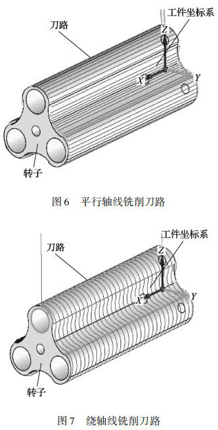三葉轉子的曲面是由多條直線組成的直紋面,加工三葉轉子這種高精度的直紋曲面必須采用四軸或五軸聯動的數控機床。三葉轉子的銑削方式有刀具路徑平行軸線銑削、繞軸線銑削兩種刀具路徑。平行軸線銑削原理為: 刀具在轉子曲面上沿 X軸從轉子的一端移動到另一端銑出一條直線,銑削下一點位時旋轉 A 軸 Z 軸聯動再次從轉子一端銑削到另一端,采用往復銑削直到完成整個轉子曲面,刀具路徑如圖 6 所示。繞軸線銑削原理為: 刀具在轉子曲面上 AZ 軸聯動刀具繞 A 軸軸線銑削,銑削下一點位時移動 X 軸,再次 AZ 軸進行聯動銑削,采用往復銑削直到完成整個轉子曲面,刀具路徑如圖 7 所示。由于繞軸銑削需要 AZ 軸聯動切削,而數控機床可以達到的進給率是由*慢的軸決定的,所以,這種刀具路徑在精加工高速銑削時并不適用。