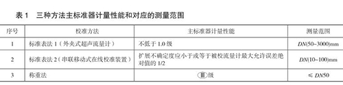 本規范包含三種校準方法,分別為標準表法 1(外夾式超聲流量計)、標準表法 2(串聯移動式在線校準裝置)和稱重法,編制組對每種方法進行了大量的實驗,并積極與管道式流量計生產廠家及用戶溝通探討,積累了豐富的經驗,獲得了大量的實驗數據,*終確定三種方法的主標準器計量性能和對應的測量范圍,如表 1 所示。