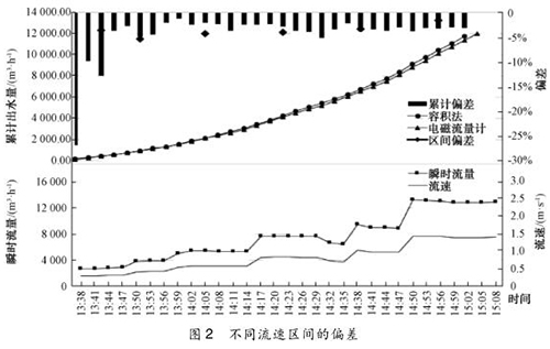 圖 2 的結果顯示,容積法校驗電磁流量計累計偏差開始階段不穩定,后期趨于穩定,在 -3. 0%附近。這是測量中不可避免存在某幾個時刻(特別出廠水流量改變時)某些測量點液位波動較大,導致記錄數值與真實情況存有較大差異,一開始累計出水總量較少,偏差會相對放大,在后期累計水量大,這一原因導致的偏差減少,偏差值也趨于穩定。