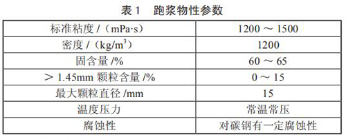 對跑漿進行分析后發現,跑漿是一種由煤漿和一些雜質混合而成的半流體物質,當甲烷流量計使用煤倉中煤堆中上部煤時,由于煤質較好,跑漿中小煤塊極少,性質同正常煤漿,只是固含量稍高;而使用煤堆底部的煤時,煤質差甲烷流量計研磨不充分,跑漿中含有約 15% 的小煤塊,分析后的跑漿物質參數如表 1 所示。