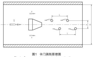 插入式壓縮空氣流量計實現流量測量的理論基礎是流體力學中**的“卡門渦街”原理,在流動的流體中裝置一個非線性三角柱形體,即渦旋發生體,如圖 1 所示。當流體沿渦旋發生體繞流時,會在渦旋發生體下游產生兩列不對稱,但有規律交替地分離釋放出一系列漩渦束,只有當兩渦漩列之間的距離 h 和同列的兩渦漩之間的距離 L 之比滿足 h/L=0.281 時,所產生的渦街才是穩定的。