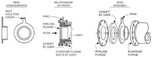 對于接地環應用,如果使用傳統的孔板式或C型接地環,則必須使用接地帶將接地環連接到流量管的主體/外殼。這些帶子連接到流量管的法蘭上,或接地線連接到位于其遠程接線盒或頂部安裝的變送器接口板上的接線片上。E型接地環使用客戶提供的螺栓,而不是接地線或接地帶。
