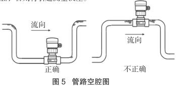 測量流向取決于高壓電磁流量計的安裝方位,將高壓電磁流量計在接頭上旋轉 180 度即可反向。正流向時,高壓電磁流量計的突耳應在上游方向。流量顯示總是正的,而累加器可以根據流向增加或者減少。安裝中確認管路設計不允許在介質中產生氣泡或空腔,否則將引起測量誤差(見圖 5)。