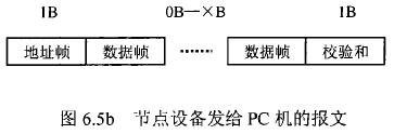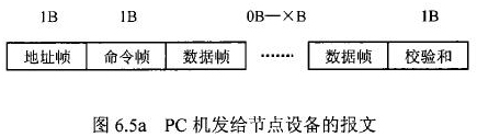 在插入式電磁流量計等節點設備和C機通信的過程中,由地址幀、命令幀、數據幀、校驗和可組成各種功能不同的報文。由于采用主從工作方式來實現通信,插入式電磁流量計等節點設備僅能接收并執行PC機發送來的控制命令,而不能發送命令給PC機。因此,由PC機發往流量計等節點設備的報文一般包括一個地址幀,一個命令幀,若干個數據幀和一個校驗和,其報文格式圖.6a5所示;而由流量計等節點設備發往PC機的報文一般包括一個地址幀,若干個數據幀和一個校驗和,其報文格式如圖6.5b所示。