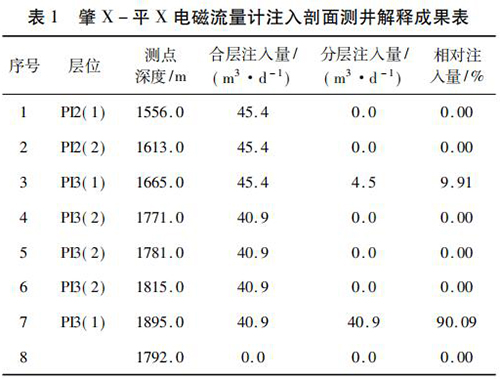 2017 年 9 月在大慶油田采油八廠肇 X - 平 X 水平井注水井中*次進(jìn)行了水平井注入剖面測(cè)井現(xiàn)場(chǎng)試驗(yàn)。該井斜深2 055. 42 m,水平段長(zhǎng)度為568. 46 m,試驗(yàn)?zāi)康氖峭ㄟ^(guò)注入剖面測(cè)井了解該井各層段的注水情況,同時(shí)對(duì)水平井測(cè)井工藝、儀器的適用性、井下?tīng)恳骷熬谳o助裝置等設(shè)備的工作有效性和可靠性進(jìn)行評(píng)價(jià)。現(xiàn)場(chǎng)試驗(yàn)中,在密閉條件下錄取到了該井的注入剖面測(cè)井資料,進(jìn)行了重復(fù)測(cè)量,重復(fù)測(cè)量結(jié)果在誤差允許范圍內(nèi),測(cè)井成果見(jiàn)表 1。該井施工壓力 6. 0 MPa,注入量45. 4 m3 /d,有 7 個(gè)射孔層,分 8 個(gè)測(cè)點(diǎn)測(cè)量,2 個(gè)層有吸入顯示,其中,P13( 1) ( 1 734 ~ 1 767 m) 層絕對(duì)吸入量4. 5 m3 /d,相對(duì)吸入量為9. 91 %,P13( 1) ( 1 899 ~1 943 m)層絕對(duì)吸入量 40. 9 m3 /d,相對(duì)吸入量為 90. 09% ,測(cè)井成果見(jiàn)表 1。通過(guò)與甲方的交流,再結(jié)合該井的動(dòng)靜態(tài)資料及周?chē)墓ぷ鳡顩r,采油廠的地質(zhì)人員認(rèn)為本次測(cè)井結(jié)果能比較準(zhǔn)確地反映該井的注入情況。