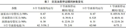 通過內(nèi)部旁通將冷油與熱油混合,經(jīng)過銅粉- 煤油 - 蠟感溫元件控制冷熱油混合比例,將油溫調(diào)節(jié)到 49 ℃。一臺智能電磁流量計穩(wěn)定運行,油泵出口母管壓力 0. 5 MPa,潤滑油母管壓力 0. 24 MPa,均屬于正常情況,而兩臺交流油泵并列運行時,停運其中一臺交流油泵瞬間會觸發(fā)智能電磁流量計出口母管壓力開關(guān)動作,說明停運瞬間油壓發(fā)生波動,且油泵出口母管油壓波動至小于 0. 45 MPa。正常運行時智能電磁流量計出口油溫 71.5 ℃,冷油器出口溫度45 ℃,混合后潤滑油母管溫度52.5 ℃,由能量守恒定律可知,經(jīng)過冷油器的油量/不經(jīng)冷油器的油量= ( 71.5-52.5) ÷ ( 52.5- 45) = 2. 53,說明有 70% 左右的油量經(jīng)過冷油器。當 2 臺智能電磁流量計運行時油量大于單泵運行,其中一臺智能電磁流量計瞬間停運時油量減少,尤其是經(jīng)過冷油器的油量大量減少,油量在溫控閥二次分配過程中出現(xiàn)調(diào)節(jié)異常,導致油壓過大波動。為檢驗溫控閥工作情況,保持 1 號、2 號交流油泵運行,選取機組正常帶負荷運行時油溫 52 ℃,分別停運 1、2 號交流油泵,觀察 1、2 號交流油泵停運瞬間油泵出口母管壓力波動情況,試驗各參數(shù)變化見表 2。