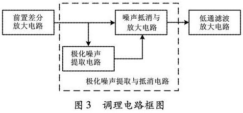 根據前饋控制的自適應極化噪聲抵消原理,設計了信號調理電路2,以實現極化噪聲的濾除。信號調理電路2主要包括前置差分放大電路、極化噪聲提取與抵消電路、低通濾波放大電路三部分。調理電路如圖3所示。