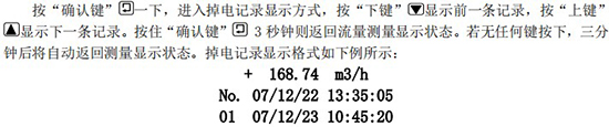 本功能只適用于帶有掉電計(jì)時(shí)功能的轉(zhuǎn)換器。儀表內(nèi)部設(shè)有不掉電實(shí)時(shí)時(shí)鐘,能夠自動(dòng)累計(jì)掉電時(shí)間多達(dá) 10000 小時(shí),掉電次數(shù) 10000 次,同時(shí)可保存 40~256 條掉電、上電的時(shí)間以及掉電時(shí)刻的瞬時(shí)流量記錄。當(dāng) 40~256 次掉電記錄記滿后,將循環(huán)保存新的掉電記錄。