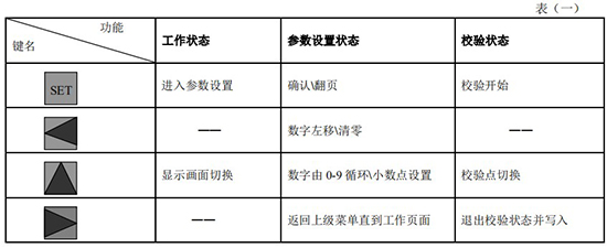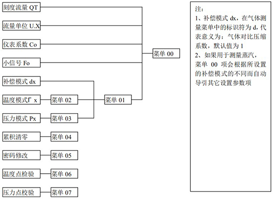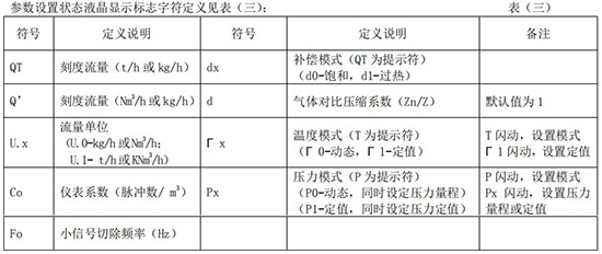 (3)標況流量計算公式(若補償后單位為 U.0):(4)標況流量計算公式(若補償后單位為 U.1):注:標況指 20℃,1 標準大氣壓三、一體化液晶顯示表頭參數設置操作說明(V03Z)1、鍵盤按鍵說明2、 顯示窗字符說明注:表中 x 代表“0”或“1”;Zn:標準狀態下(20℃,1 標準大氣壓),被測氣體的壓縮系數,Z:工作狀態下被測氣體的壓縮系數3、 操作說明3.1、本儀表表頭采用自導引式和菜單式相結合的參數設置方式,所謂自導引式參數設置方式就是用戶在進入菜單 00 項后,表頭中的微電腦會自動導引用戶去設置需要設置的參數。另外,用戶也可以通過菜單模式分別對各組參數進行設置。蒸汽測量菜單框圖如下:3.2、參數設置約定:在設置各項參數時,提示符閃動代表該項參數沒有設置完或者尚未確認,可以通過按SET 鍵來確認或者按→鍵退出;提示符不閃動代表該項參數已設置完并確認,此時可以通過按 SET 鍵翻頁或者按→鍵退出。進入參數設置時,需要輸入密碼(6 位)并確認進入,為了防止誤進入參數設置菜單,保證儀表正常工作,在設置密碼時,使用↑鍵調數時不能循環調數,只能單次調數,只有密碼輸入正確進入各項參數設置菜單后才可以對各位循環連續調整數據。3.3、儀表參數設置舉例:儀表出廠前各項參數已設置好,用戶無需設置。如果用戶需要設置某項參數,請參照以下步驟,例如修改刻度流量值 QT:在工作狀態下,按 SET 鍵,顯示屏顯示 P,數字位為全零,8 秒鐘若無操作,自動返回工作狀態。輸入密碼 :按數字↑鍵和左移←鍵,輸入密碼數 xxxxx(出廠時默認密碼為 000123),↑鍵調各位數字 0-9,每按 ←鍵一次數字向右循環一位,可通過多次按←鍵對整段數字清零,按→鍵可以返回工作狀態。菜單選擇項:按 SET 鍵確認,顯示屏顯示如右圖所示,末行“00”閃動調整該項值選擇不同參數設置菜單。該例直接按 SET 鍵進入菜單 00 項設置刻度流量:QT 閃動,*一步:*先進行小數點調整,可以通過←鍵對參數快速清零或者通過↑鍵進行小數點調整,調整完畢,按 SET 鍵確認(QT 仍閃動);*二步:數值調整,可以通過↑鍵對每位數字進行調整,按 ←鍵一次數字向右移動一位,調整完畢,按 SET 鍵確認,QT 停止閃動,該項參數設置完畢,可進行下一項參數設置或者退出另外,單位設置 U.X 和補償方式設置 dX 通過↑鍵調整修改。3.4、校驗項說明: 儀表出廠前,溫度和壓力通道已校驗設置好,無需用戶重新校驗。校驗通道有密碼保護,廠家不對外開放,如果需要重新校驗溫度或者壓力通道,請專業人員與廠家技術人員聯系。4、計算公式說明4.1、蒸汽測量計算公式(1)渦街流量儀表工況體積流量計算公式:(2)密度 d,單位 Kg/m3(3)質量流量計算公式,單位 Kg/h:(4)質量流量計算公式,單位 t/h:4.2、氣體測量計算公式----標況指 20℃,1 標準大氣壓(1)渦街流量儀表工況體積流量計算公式:(2)對比壓縮系數 d(Zn/Z),單位 1(3)標況流量計算公式,單位 Nm3/h:P1—工況絕壓,PN—標況絕壓(Mpa),T1—工況熱力學溫度,TN—標況熱力學溫度(K)