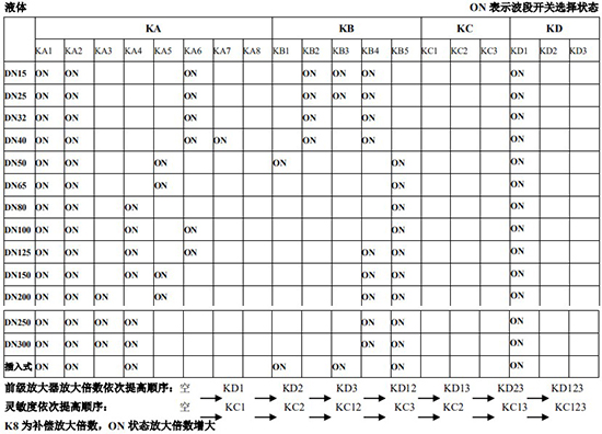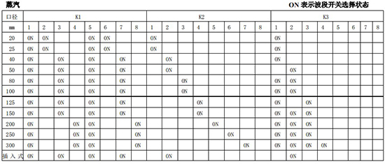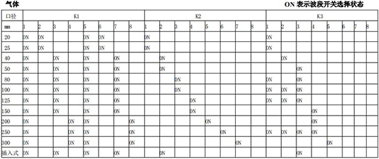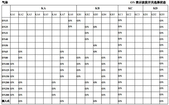 (4)標況流量計算公式,單位 t/h:四、AMPKP09A01 放大板波段開關調整參照表五、AMPSW10A01 放大板波段開關調整參照表RG=1-F 調放大器增益,由 1 至 F 依次增大(常用 4-8);RS=1-F 調觸發靈敏度,由 1 至 F 依次提高(常用 4-8)不同口徑和介質開關選擇參見附表。并根據實際信號先調整 K2 和 K3 擴展頻帶,必要時調整 K1 電荷放大器增益以上表值僅供參考,實際使用中因液體粘度和氣體密度不同應在此值附近調整,頻率低時可將 K3 向大口徑方向調一至三檔。頻率高時可將 K2 向小口徑方向調一至三檔。訂貨須知及選型樣譜一.尊敬的用戶,當您要選用本公司產品時,請仔細閱讀選型樣本,并做好以下工作:1.認真核對被測介質的工況條件:溫度、壓力、管徑等工藝參數。2.認真核對被測介質的使用流量范圍,特別是*小流量值以*終確定使用儀表的口徑及配管參數。3.確定儀表的安裝地點,保證直管段,并為儀表的安裝維護創造好的環境條件。4.填好訂貨咨詢單,見附表三二.渦街流量儀表選型表(符合 JB/T9294-1999 標準)1.傳感器選型表上一篇:污水流量計的種類