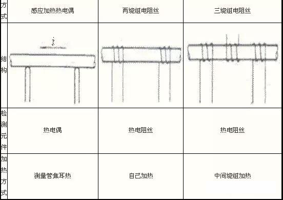 測量管加熱方式大部分產品采用兩繞組或三繞組線繞電阻;除管外電阻絲繞組加熱方式外還有利用管材本身電阻加熱方式,如表1所示。測量管形狀有直管形,還有∏字形結構,三繞組中一組在中間加熱,兩組分繞兩臂測量溫度。